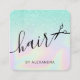 carte de visite coiffeur élégant et joli avec une parties scintillant à la menthe à l'ombre, une texture holographique, des ciseaux et une police calligraphique élégante.