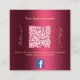Un arrière - plan à dégradé bordeaux. Personnalisez et ajoutez votre nom d'entreprise, votre propre code qr à votre compte Facebook et un texte. Le texte : Suivez-nous ! Avant ou arrière : votre logo et vos coordonnées.