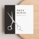 Elégant modèle de carte de visite personnalisable avec FAUX argent ciseaux icône et gris foncé/blanc rayures arrière - plan. Design cool moderne pour salon de coiffure, coiffeur, coiffeur.