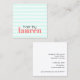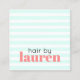 Modèle de carte de visite entièrement personnalisable cool avec rayures bleu/blanc turquoise, texte pastel en gras. Design moderne et élégant, parfait pour salon de coiffure, coiffeur, coiffeur.