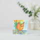 Un carte de visite carré amusant avec une poule brun doux à la recherche de nourriture autour de l'automne feuilles dessinées avec de l'encre sépia et peintes avec de l'aquarelle avec un arrière - plan de lavage à l'aquarelle bleue et à l'envers.