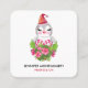 Un carte de visite au design mignon et fantaisiste avec un adorable pingouin portant un chapeau de santa rouge. Derrière un bouquet de fleurs aux sucres de canne rayés roses et blancs.