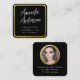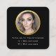 Ce design carte de visite moderne et chic est orné d'un arrière - plan noir aux accents de faux papier doré, de votre photo, et d'informations sur les médias sociaux en face. Sur le dos il y a le même arrière - plan noir avec des accents faux feuille d'or, écriture blanche et simple typographie. Les couleurs de texte peuvent être customisées à l'aide de l'outil d'édition. Ce design fait une déclaration chic et une impression fabuleuse pour votre entreprise en pleine croissance. Ce design serait parfait pour de nombreux types d'entreprises créatives parce qu'il est simple mais élégant et moderne.
