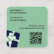Carte de visite professionnel élégant pour un emballage cadeau de vacances. Chaque côté dispose d'un modèle modifiable. Le modèle avant est pour votre nom et vos coordonnées. Le modèle arrière est pour des informations de contact supplémentaires comme des poignées de médias sociaux, des informations sur le site Web, et un code QR pour un accès rapide à votre site Web. Le design à l'avant est composé d'un arrière - plan vert avec chapeaux de Père Noël et d'un arrière - plan bleu foncé avec texte blanc, feuilles de pin et points rouges et blancs. À l'arrière, le design a le même arrière - plan vert avec une illustration numérique d'un cadeau, du texte noir et un code QR. Conception par Ms_Jade. © Ms_Jade
