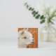 Cute, white alpaca face, business discount, or loyalty cards. This pack of 100 cards makes it easy to thank customers by offering a discount or other promotion for return business. A fluffy, white alpaca is the image on the front of 2.5 inch square cards. Dark brown stained wood boards are the background for text on both sides. "Thank you" text on the front with, two more places to customize on the back. Include a personal message and shop name and location.