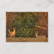 Cette carte de commerce d'artistes de beaux-arts présente un lever du soleil matinal avec deux cerfs de Virginie (odocolleus virginianus) qui dorment au pied d'un arbre à feuillage persistant vert. Leurs yeux, le cou et la queue sont blancs. La forêt est teintée de lumière orange.