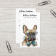 Ces cartes de visite français de soins pour animaux de compagnie Bulldog présentent un aquarelle peint à la main d'un mignon chien français portant une cravate arc et des lunettes. Parfaites pour les toiletteurs de chiens, les gardiens de chiens et tous les professionnels de l'industrie de l'entretien des animaux de compagnie, ces cartes sont professionnelles et adorables. Personnalisez avec le nom du propriétaire de l'entreprise, le titre/le nom de l'entreprise et tous les coordonnées. Parfait pour les marcheurs de chiens, le toilettage de chiens, les gardiens de chiens et toutes les activités liées à l'entretien des animaux de compagnie". Le carte de visite est à double face. Cette collection d'affaires de bulldog français sera un favori des amoureux et des amoureux de les chiens français. DROIT D'AUTEUR © 2023 Judy Burrows, Black Dog Art - Tous droits réservés. Chien de taule français Personnalisé Chien Groomer Animaux de compagnie Carte de visite