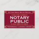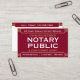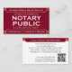 Créez une apparence professionnelle avec ce design classique de carte de visite public notaire. Un modèle modifiable personnalisé avec votre nom et vos coordonnées commerciales. Le dos comprend un code QR scannable, invitant les clients à visiter votre site Web ou à prendre rendez-vous. Tout le texte peut être customisé ou supprimé afin d'inclure les informations souhaitées. Parfait pour un notaire public, un agent de signature de prêt, un agent de livraison certifié de fiducie de notaire, l'ACNT, un notaire mobile, un appostille ou toute autre profession juridique. Couleurs imprimées : bordeaux foncé, blanc et or. Magasinez la collection en ligne pour des idées et des fournitures de produits plus populaires, conçus pour les notaires!