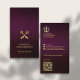 Elégant violet foncé et or notaire carte de visite est un carte de visite professionnel pour notaire marketing public. Facile à customiser, ces cartes de faux or de luxe disposent d'une icône croisée de stylo qui peut être remplacée par votre logo d'entreprise. Modifiez tout le texte, la photo de notaire et le code QR avant d'acheter.