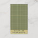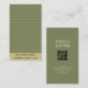 Conception carte de visite avec un motif à damiers vert profond dans une mise en page propre et minimale, avec un code QR pour un accès rapide à un site Web ou un portfolio. Convient aux marques de vêtements faits main, aux professionnels créatifs ou aux entreprises de caractère.