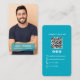 Design de contact photo moderne avec un fond dégradé sarcelle et un code QR scannable pour une connexion facile. Cette mise en page personnalisable comprend un espace pour une photo professionnelle, un nom, des icônes sociales et des coordonnées, ce qui la rend parfaite pour les entrepreneurs, les indépendants et les propriétaires de petites entreprises. Un moyen élégant et minimaliste de partager vos informations et d'améliorer votre marque.