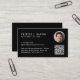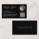 Carte de visite professionnel noir minimaliste et élégant avec votre photo dans un petit cercle, votre nom, titre et informations de contact (tels que email, numéros de téléphone, nom de l'entreprise et adresse postale) dans une typographie blanche propre, simple et moderne. Entrez une adresse URL pour créer un code QR numérisable lié à votre site Web, profils de réseaux sociaux ou toute autre plate-forme qui présente votre travail, ce qui facilite l'exploration de votre expertise par d'autres personnes. Au verso, customisez du texte supplémentaire ou laissez vide.