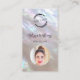 Cette carte de visite de luxe élégante présente un design nacré iridescent et un script manuscrit élégant. Sur la face avant se trouve un logo personnalisé et une photo. Au verso se trouve un code QR scannable et un modèle personnalisé pour le nom, l'adresse et les réseaux sociaux. Cette carte de visite glamour professionnelle est parfaite pour les salons, les artistes maquilleurs, les bijouteries et plus encore.