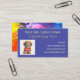 Purple business cards with place for a photo, or logo. Made as a knitting business card, with a square template to hold either an image or company logo. Text is white with a black shadow. Two lines at the top for business title and owner's name. Add more text, such as online locations, contact, address, to the bottom. That text aligns to the right. A painted design covers the back.