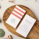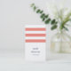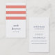 Design carte de visite moderne et chic dans un format vertical unique, avec trois larges bandes de corail sur un arrière - plan blanc, avec votre nom et nom d'entreprise ou titre dans un joli mélange de serif minuscule et de caractères casquette modernes. Ajoutez vos coordonnées complètes à l'arrière en bleu marine classique. Convient à toute profession; exemple pour les professions designs d'intérieur.