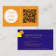 Un design moderne épuré aux couleurs contrastées et audacieuses, orange, bleu foncé et jaune. Simple et moderne. Toutes les informations de contact dont vous avez besoin : nom, titre, médias sociaux, adresse, téléphone, site web et e-mail. Carte de visite classique mais avec une combinaison de couleurs vibrantes. Ajoutez votre propre logo et code QR.