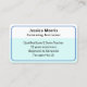 Faites bonne impression avec ce carte de visite moderne et élégant pour un moniteur de natation. Personnalisez avec votre nom, le titre de votre emploi et plus d'informations sur le devant, et vos coordonnées au verso de la carte. Au dos il y a aussi un code QR, auquel vous pouvez ajouter votre propre URL de site Web, pour les clients potentiels à scanner et en savoir plus. Le design utilise un jeu de couleurs simple de bleu et blanc avec du texte noir.