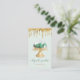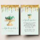 This elegant bakery business card features an illustration of a place of emerald green cupcakes on a gold platter under a glass dome. Customize it with your business name in green handwriting script with swashes at the beginning and end, and your contact information in gold-colored sans serif font on a pale green background, with a top border of gold dripping faux foil. The reverse side repeats the design and provides space for contact information and other details. (To keep the swashes before and after the business name, replace only the letters in those text fields, leaving the symbols in place.)