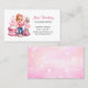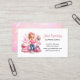 This eye-catching business card showcases a delightful, illustrated character holding cleaning supplies, surrounded by sparkling bubbles and professional cleaning equipment, including a mop, vacuum cleaner, and cleaning caddy. The playful yet professional pink and white color scheme conveys cleanliness, trustworthiness, and attention to detail—essential qualities clients seek in their housekeeping provider.