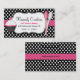 Joli carte de visite de boulangerie fait à un arrière-plan noir et blanc de point de polka, avec une bande audacieuse rose, à travers le milieu, et un secteur blanc bordé noir décoratif des textes, sur l'avant. Les graphiques lunatiques du petit gâteau rose, blanc, et noir décore l'aile gauche, de la carte et des cuillères roses et blanches du côté droit. Le texte est entièrement personnalisable pour adapter à vos besoins d'affaires. Grand pour à la maison des boulangers aussi.