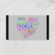 Un carte de visite gentil avec des mots inspirants associés au yoga, arrangé en forme de coeur.