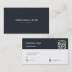 Simple entreprise noir QR Code carte de visite dans un style minimaliste moderne. Le modèle peut être facilement mis à jour avec votre code QR et vos coordonnées. Le côté avant est bleu foncé, le côté arrière est blanc et bleu