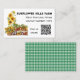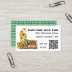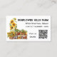 Cartes de visite du marché à thème agricole. Fleurs de soleil et légumes sur les étagères est le design sur les cartes blanches avec du texte noir. Ajoutez également un code QR pour diriger les clients vers plus d'informations en ligne. Remplacez le modèle de code par votre propre image de code. Des en vichy verts recouvrent le dos des cartes.