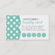 Ce design carte de visite client super mignon dispose d'un arrière - plan à accent pois chéri. Le dos de la carte contient des informations à customiser pour votre programme de fidélité client et des points roses amusants à poinçonner ou à commencer avec chaque achat. Personnalisez facilement vos informations commerciales ou personnelles et faites une déclaration avec ces cartes de visite de fidélité client chères. Ce design carte de visite polyvalent de fidélité à la clientèle est idéal pour une entreprise de boulangerie, artisanale ou artisanale, coiffeuse, couturière, maquilleur et plus encore ! Cliquez sur le bouton orange "Customisez-le" pour accéder à l'outil de conception où vous pouvez modifier la police, la taille du type, la couleur du type, le positionnement du texte et plus encore. The Spotted Olive™ est votre source en ligne pour des designs branchés, mignons et cool sur cartes de visite branchés, invitations et annonces tendance, cartes de fin de année modernes et élégants et cadeau personnalisé unique. Copyright 2013-Present | L'Olive tacheté™ | Tous droits réservés