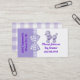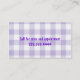 carte de visite à thème mignon avec un arrière - plan violet et blanc, avec des graphiques de en vichy ruban violet et blanc et d'arc entre les deux couleurs. Les graphiques d'un caniche mauve à l'air doux et souple décorent le côté blanc supérieur de la carte, avec du texte mauve personnalisé sous elle. Le texte personnalisé mauve s'exécute de côté, sur le côté violet plus clair de l'avant. Un motif à damiers violet et blanc, à l'arrière de la carte, correspond au ruban et à l'arc, à l'avant, et le texte personnalisé est prêt à être personnalisé. Personnalisez cette carte amusante pour votre entreprise.