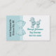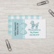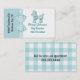 Carte de visite à thème chien mignon fait d'un arrière - plan turquoise et blanc, avec des graphismes d'un ruban en vichy turquoise et blanc et arc entre les deux couleurs. Les graphiques d'un caniche à l'apparence douce et turquoise ornent le dessus blanc de la carte, avec du texte turquoise personnalisé sous elle. Le texte personnalisé gris foncé s'exécute de côté, du côté turquoise de l'avant. Un motif à damiers bleu turquoise et blanc, à l'arrière de la carte, correspond au ruban et à l'arc, à l'avant, et le texte gris personnalisé est prêt à être personnalisé. Personnalisez cette carte amusante pour votre entreprise.