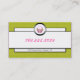 Favorisez vos affaires de boulangerie de petit gâteau de café avec ces vert de chaux mignon et lunatique, rose, points mignons et lunatiques noirs et blancs de monogramme et carte de visite de petit gâteau. Ce carte de visite comporte un arrière - plan lumineux de points avec un cadre de cercle avec une lettre de monogramme à l'intérieur. La conception a posé des rectangles montrant votre information d'affaires. Sur le dos est un petit gâteau mignon montré dans un cadre circulaire. Ce carte de visite audacieux, moderne, et élégant est également un grand match pour des traiteurs, des cafés, des boulangeries, des entreprises de petit gâteau, des planificateurs de partie, des boulangers, des chefs, des affaires fournissant des pâtisseries aux détaillants, des wedding planners, des dessinateurs d'intérieurs, des couturiers, des spas, des salons, des techniciens de clou, des manucures, des estheticians, des esthéticiens, des magasins détaillants d'habillement, des magasins de bijoux, et plus. Conceptions de ©2011 Pam.