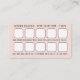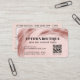 Carte de visite sur mesure avec design métallique rose avec typographie sans-serif, et système de récompense classique à l'arrière pour les clients de recevoir quelque chose, c'est-à-dire remise, article gratuit, etc. Cliquez sur Personnaliser pour ajouter les détails de votre entreprise, y compris le nom, le type de service, le numéro de téléphone, le site Web, l'adresse, le code qr avec du texte, les heures de magasin, les informations supplémentaires et le système de récompense au verso.