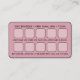 Ce carte de visite a un design de texture satinée rose avec un cadre central rose pour vos détails et la typographie sans-serif, et dispose d'un système de récompense classique sur le dos en rose pour les clients à retourner et recevoir quelque chose, c'est-à-dire remise, article gratuit, etc. Remplissez les détails avec le nom de votre entreprise, le service d'affaires, le numéro de téléphone, le site Web, l'adresse, l'adresse sociale, l'url de code qr, les heures de magasin ou le message, et les informations de récompense au verso.