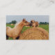 Les nez émouvants de pouliche de palomino et de chien aux cheveux longs au-dessus d'une balle de foin fait une image douce pour le carte de visite animal. Les vétérinaires, délivrances, éleveurs, amoureux des animaux en général aimeront cette scène précieuse.