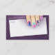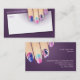 La conception de carte de visite renversante, pour les techniciens d'ongle, manucures, et le salon d'ongle, cette carte comporte les illustrations réalistes et chiques des ongles de salon avec de diverses conceptions de vernis à ongles sur un arrière - plan plus foncé pour un impact plus visuel. Cette carte a été conçue par un vrai concepteur professionnel particulièrement pour des professionnels d'ongle. Sur le dos de la carte une autre illustration et un secteur pour des notes, telles que noter leur prochain rendez-vous. Plus conçoivent des variations, cartes de rendez-vous et les produits peuvent être disponibles avec ce thème. Veuillez examiner le faire-part avant de magasin chez www.zazzle.com/artbymonica pour assurer plus d'information.