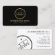Ce design carte de visite moderne est doté d'un logo de trois dents serti dans un cercle avec de petites étoiles qui indiquent un sourire propre et sain. Votre nom ou votre nom d'exercice est défini en gras. Cette carte recto-verso permet une grande place sur l'arrière pour vos détails et coordonnées. Le carte de visite idéal pour les dentistes, les cabinets dentaires, le blanchiment des dents, les placages, les parodontistes ou toute entreprise dentaire. La palette de couleur faux or et noir est élégante et attrayante. Art et design originaux © 1201AM Design Studio