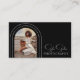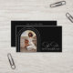 Design Design Modern Script Photo QR Code Photographie Photographe Carte de visite dispose d'un script doré élégant et élégant avec votre photo préférée dans les arches en argent avec vos détails d'affaires et le site Web d'affaires personnalisé QR code au verso. Au verso, vous trouverez vos coordonnées personnalisées. Conçu par © Evco Studio www.zazzle.com/store/evcostudio