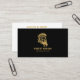 Logo de coupe de cheveux ornementale or pour hommes avec texte personnalisé en or sur un arrière - plan noir et texte en or sur blanc à l'arrière de la carte.