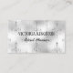 Cet élégant carte de visite, adapté à une entreprise d'organisation d'événements, maquilleur, coiffeur ou autre consultant créatif, dispose d'un arrière - plan de papier métallique imitation argent glam avec un élégant motif de lustre. Personnalisez vos informations à l'aide des champs de modèle fournis. "Cliquez pour customiser plus loin" pour modifier le style ou la couleur de la police.