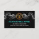 Une onde d'éclair électrique s'écoule sur le visage de la carte en zappant à travers un logo d'ampoule d'or. Sous le logo or se trouve le nom commercial suivi de votre prestigieux nom et coordonnées.