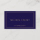 Design élégant moderne bleu marine et or avec des informations dans le style de police professionnel or avec bordure or. Parfait pour un designer, styliste, consultant, agent immobilier et de nombreuses autres professions. Veuillez noter que la feuille d'or affichée sur le produit est un effet imprimé, pas une feuille d'or réelle.