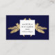 Une paire élégante et inattendue de libellules en faux or se dresse derrière une boîte stylisée portant votre nom ou nom d'entreprise sur ce carte de visite bleu marine foncé. Cette carte recto verso permet à votre marque de prendre note sur l'avant de la carte, tout en laissant une grande place pour vos coordonnées sur l'arrière. Un beau carte de visite design parfait pour les métiers de design d'intérieur, styliste, blogger style de vie, jardinier, cosmétologiste et plus encore. © 1201AM Design Studio