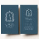 Cet élégant design carte de visite vertical présente une crête vintage ornée en blanc sur un arrière - plan indigo, encadrant une paire d'initiales monogrammes en police serif ouverte. Ajoutez vos nom, titre et (au verso) coordonnées en blanc sur indigo.