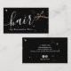 Ce design carte de visite de coiffure moderne présente des ciseaux d'or rose en faux cuivre, un arrière - plan en marbre noir et une police de calligraphie élégante.