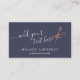 Cartes de visite modernes et élégants pour coiffeurs avec ciseaux d'or faux rose en cuivre, arrière - plan bleu marine et police de calligraphie élégante.