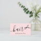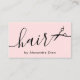 Ce design carte de visite moderne et coiffeur présente des ciseaux noirs, un arrière - plan rose pastel et une police de calligraphie élégante.