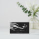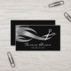 Beau carte de visite de coiffure avec poils de texture faux métallique argenté, ciseaux, arrière - plan noir et police calligraphie élégante.