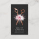 cartes de visite modernes et élégants pour coiffeurs avec ciseaux d'or rose en faux cuivre, roses roses roses et blanches et police calligraphie élégante.