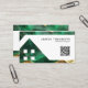 This modern business card features a rich emerald green marble design with luxurious gold rock texture accents on a clean white background. The layout includes a bold geometric house shape, making it perfect for real estate professionals.
