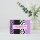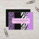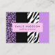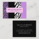 Cartes de visite élégants, élégants et sophistiqués avec motif léopard et zèbre de couleur violette. Design moderne et tendance, parfait pour les amateurs de poster de animal.
